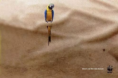 世界自然基金会:不要砍雨林。海报中,在沙漠中只剩一只鸟,顿生恻隐之心。