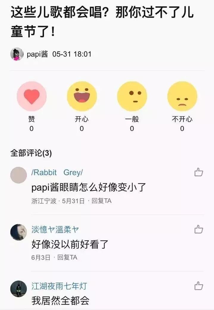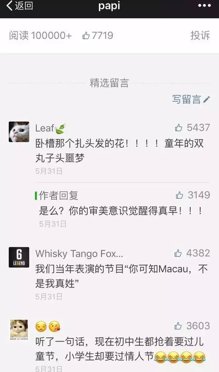 堪称短视频网红第一人,papi酱的视频几乎篇篇10w+,粉丝的点赞和留言也是积极踊跃。比如,这篇六一儿童节前夕的《这些儿歌都会唱?那你过不了儿童节了!》,轻松斩获10w+和7720赞。