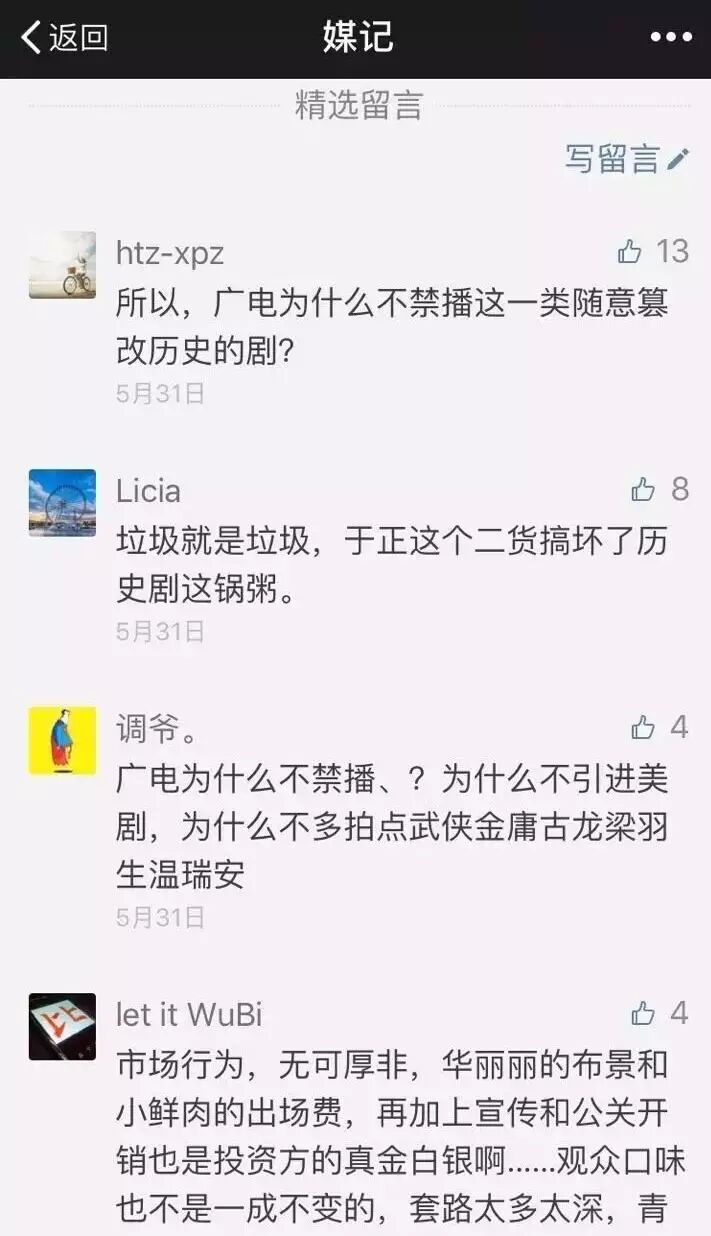 公众号“媒记”5月31日推送了一篇影视评论《这样胡乱改编,屈原都要被气活了!这些古装剧好意思叫历史剧吗?》,微信阅读仅为2630,文末6条精选留言。