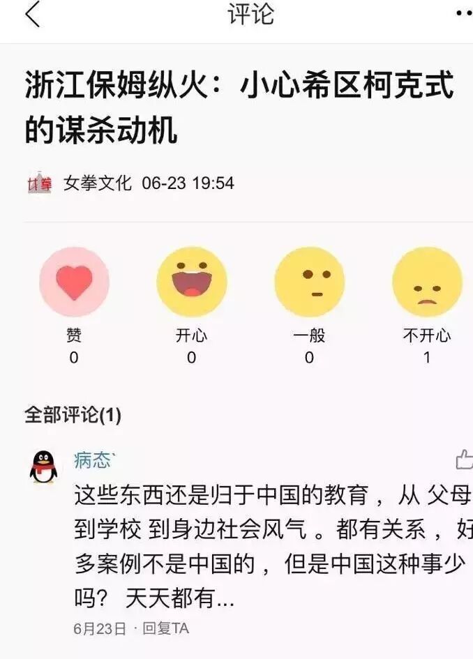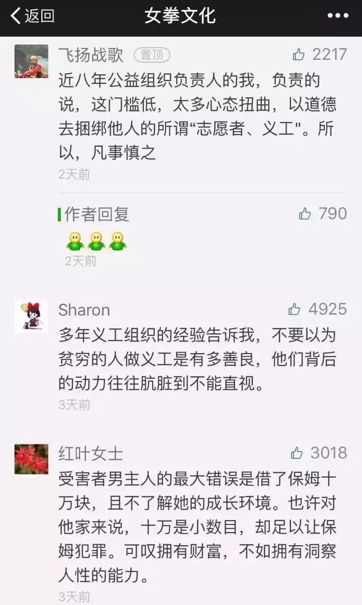 为此,我挑选了一篇焦点跳脱事件本身的文章,来自公众号“女拳文化”推送的《浙江保姆纵火:小心希区柯克式的谋杀动机》,微信公众号阅读10w+,精选留言点赞前几条如下: