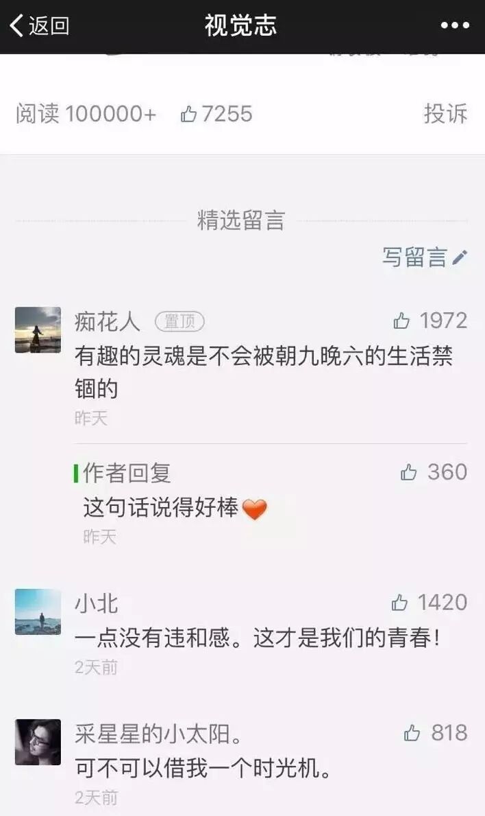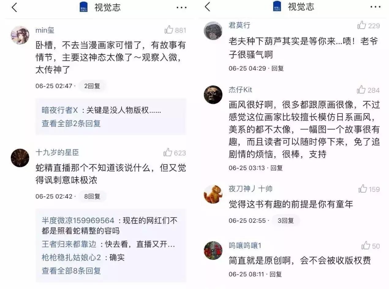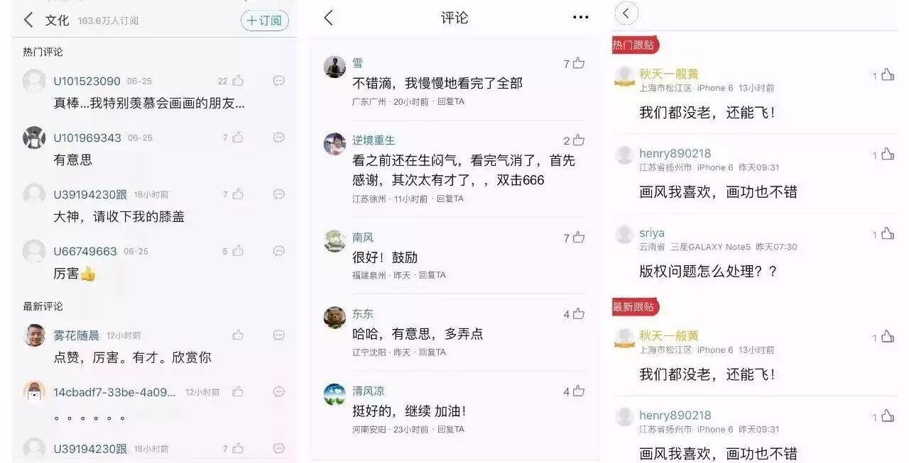 一位爱画画的胡渣叔叔把小时候的各种动画人物混搭,这篇视觉志的推送在微信上,呈现的评论如下: