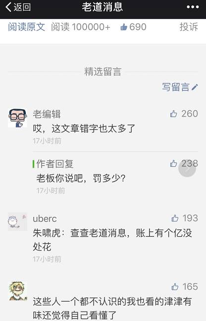 前几天,因为和马化腾在朋友圈互怼,小黄车的幕后投资人朱啸虎被更多人谈及,今天,“老道消息”推了篇文章《谁人不识朱啸虎》在新媒体人的朋友圈小规模的刷屏,文章阅读数很快破了10w+,在微信公众号上,文章评论是这样的:
