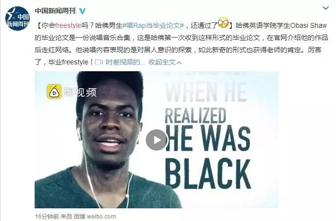 不仅如此,Freestyle的喷薄之势还蔓延到了国外!一位哈佛英语学院的学生以一份说唱音乐合集作为自己的毕业论文。并且,他还因说唱内容表现出对黑人意识的探索,得到了老师的肯定!这位同学,毕业freestyle!