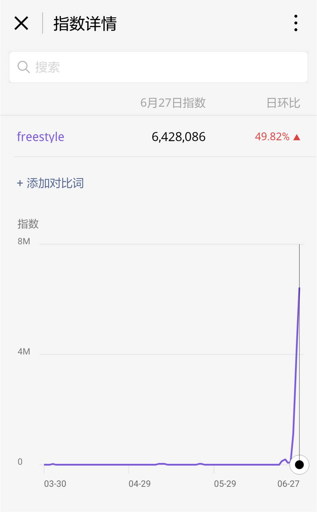 (榜妹以“freestyle”为关键词进行搜索,其微信指数从6月24日《中国有嘻哈》节目播出后直线上升,在6月27日达到峰值。)