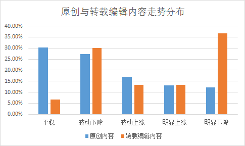 在新榜一项针对500强大号的调查中我们也发现,依靠转载的公众号受到的冲击和流量下滑比原创账号严重得多。