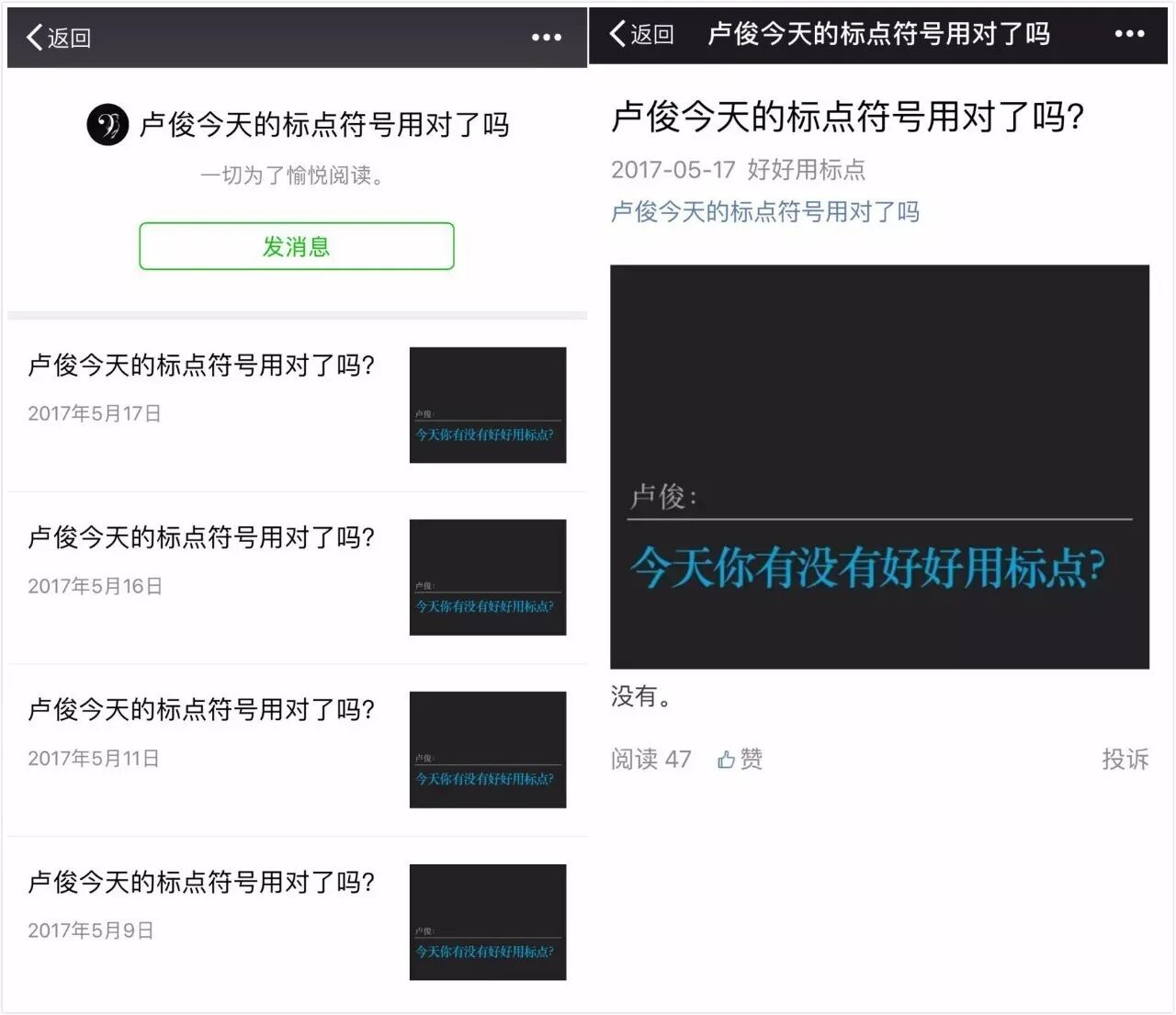 曾有个卢俊的粉丝专门开了个公众号,叫“卢俊今天的标点符号用对了吗”。