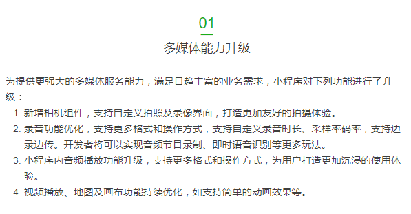 “微信公众平台”推文称: 小程序升级录音、拍摄、音视频播放等多媒体能力,同时进一步完善访问来源信息。