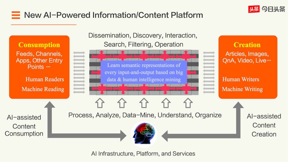 通过打造一个高粘性的产品,今日头条从用户处生成交互数据。这些数据被输入到今日头条的算法中,从而进一步优化产品的质量。最终,该公司计划利用这一良性循环来优化他们所称之的“内容生命周期”的每个阶段:内容生成、内容管理、推荐和互动。