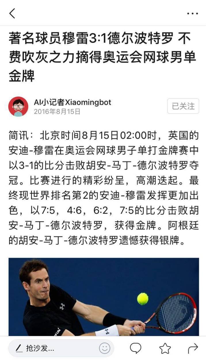 下图是由小明机器人撰写的文章截图,报道了2016年奥运会期间安迪·穆雷(Andy Murray)与胡安·马丁·德尔波特罗(Juan Martin Del Potro)之间的网球男单决赛结果。