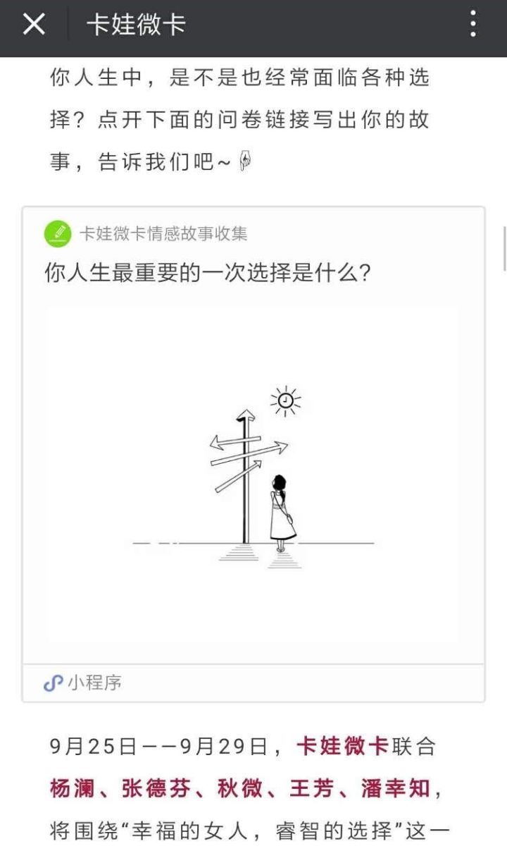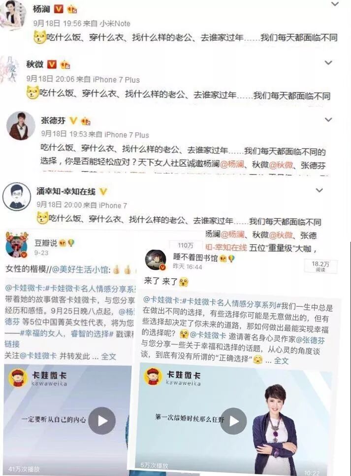 9月23日起,卡娃微卡邀请主讲人杨澜、张德芬和秋微,围绕“现代都市女性的选择与幸福”,在公众号上推出三期“名人情感分享系列”推送。