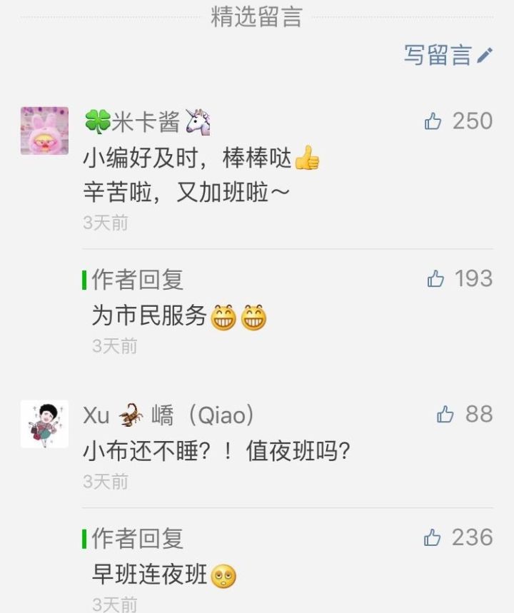 “上海发布”的评论区和后台一直都很热闹,对于一些民生议题,会大量运用点对点的方式逐条答复。常有网友留言问“小布你怎么24小时都在线啊,到底有多少个小布?”(答案是7个小编+2个美编)在今年4月粉丝数破300万时,“小布”写给读者的信中也说,这是一份365天*24小时的工作。