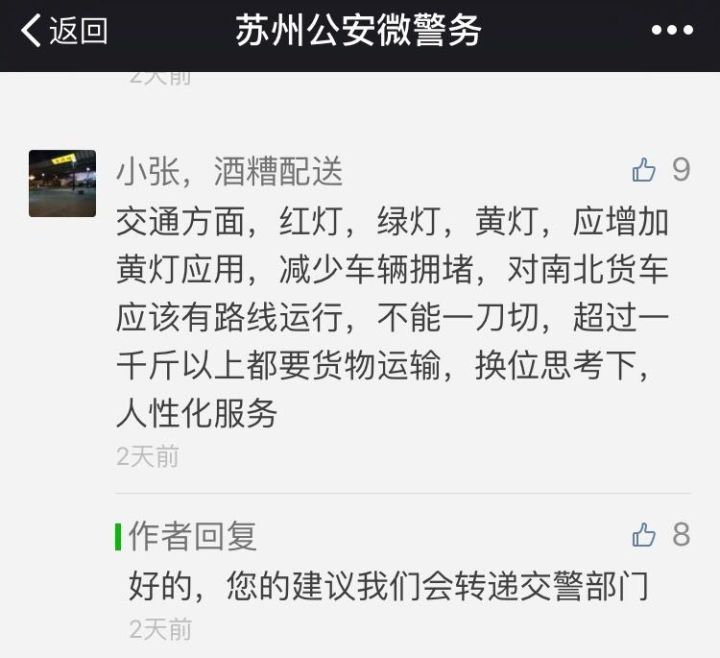 让网友提出的建议得到正面反馈,也是政务类公号需要努力做到的。比如“苏州公安微警务”就在一位网友关于改善交通问题的建议下回复:会转递交警部门。