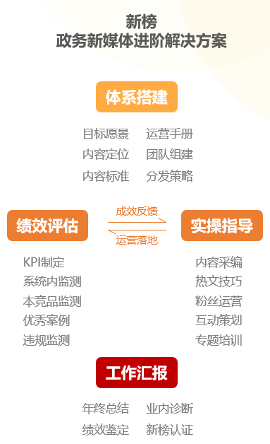 新榜推出专门针对政务新媒体的进阶方案,从体系搭建、绩效评估、实操指导、工作汇报四个方面,助力政务机构快速掌握新媒体运营技巧,显著提升工作表现。