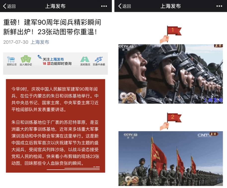 要想内容有更好的传播性,“速度”与“话题性”这两个要素缺一不可。如何把这两者完美结合?“上海发布”今年7月30日的阅兵推文就是一个很好的范例。
