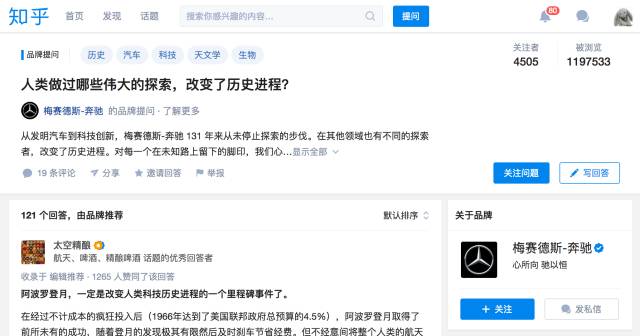 从最早的知乎日报「这里是广告」栏目,到原生文章广告,再到近期梅赛德斯-奔驰的品牌提问(原生问答广告)
