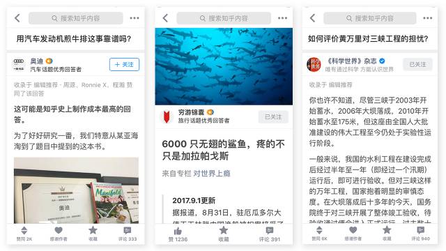 与微博微信以人为组织形态的社交平台不同,知乎是以内容和话题为信息组织和传播形式。
