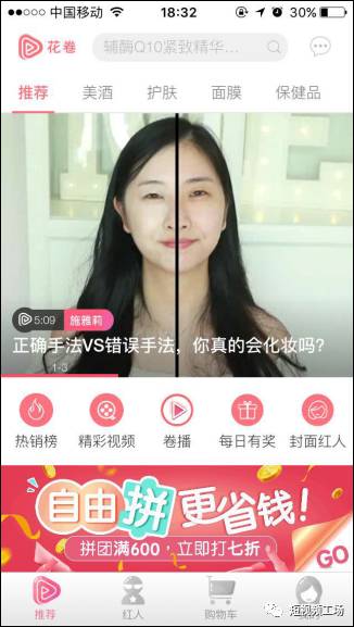 但无论是首页的“推荐”频道,还是“红人”频道里,几乎清一色都是美妆短视频和对应的美妆产品。所以,虽然“花卷”并没有直接定位美妆短视频电商平台,也足以看出其对美妆领域的重视程度。