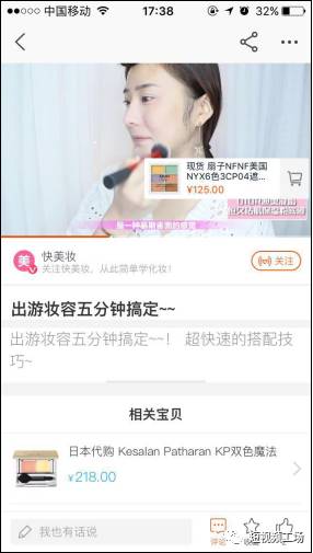 以“快美妆”为例,在一个《出游妆容五分钟搞定》的视频中,达人在化妆过程中,视频右侧会出现相应产品的链接,可以点击直接购买。完成购买动作之后,短视频会继续播放,不影响观看体验,整个过程显得流畅、直接。