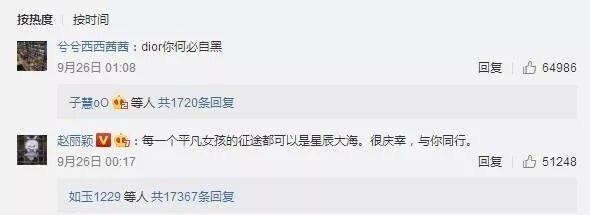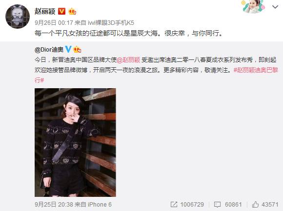 赵丽颖在转发Dior 微博时表示,“每一个平凡女孩的征途都可以是星辰大海”。