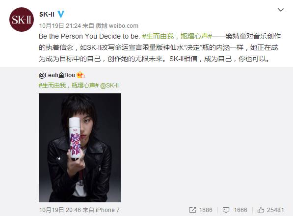 “窦靖童对音乐创作的执着信念,如SK-Ⅱ改写命运宣言限量版神仙水‘决定’瓶的内涵一样,她正在成为目标中的自己,创作她的无限未来。SK-Ⅱ相信,成为自己,你也可以。”