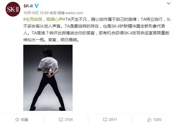 从SK-Ⅱ发布在微博上的介绍来看:“TA天生不凡,随心创作属于自己的旋律;TA特立独行,从不妥协盲从他人声音。TA是最独特的存在,也是SK-Ⅱ护肤精华露全新形象代言人。”