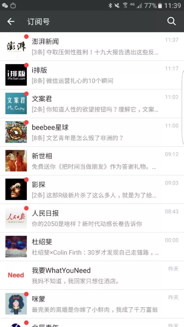 改版前,微信的订阅号的推送,是将所有公众号折叠起来,根据推送的时间顺序进行排列,未读的消息会有小红点和未读量提醒。点开公众号名片之后,才是一篇篇推送文章。打开文章至少需要3步。