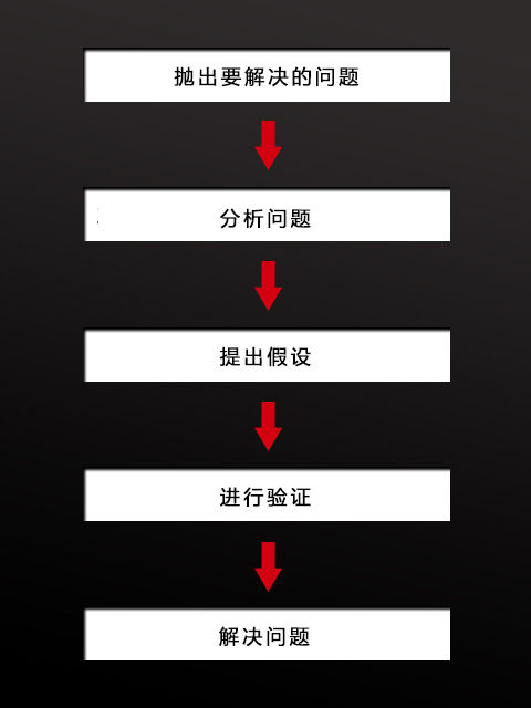 抛出要解决的问题—分析问题—提出假设—进行验证—解决问题。