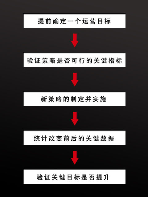首先,提前确定好你的运营目标;然后确定能验证假设策略是否可行的关键指标;再然后进行新策略(改变)的制定并实施;接着统计“改变”前后测试周期内的关键数据;最后验证关键目标是否提升。