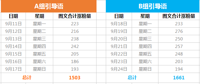 这里,我们对验证前后的每天图文合计涨粉量做了统计, 并制成表格。(注意测试期间不要做过多的干扰,比如大型活动,如果有可以排除掉)