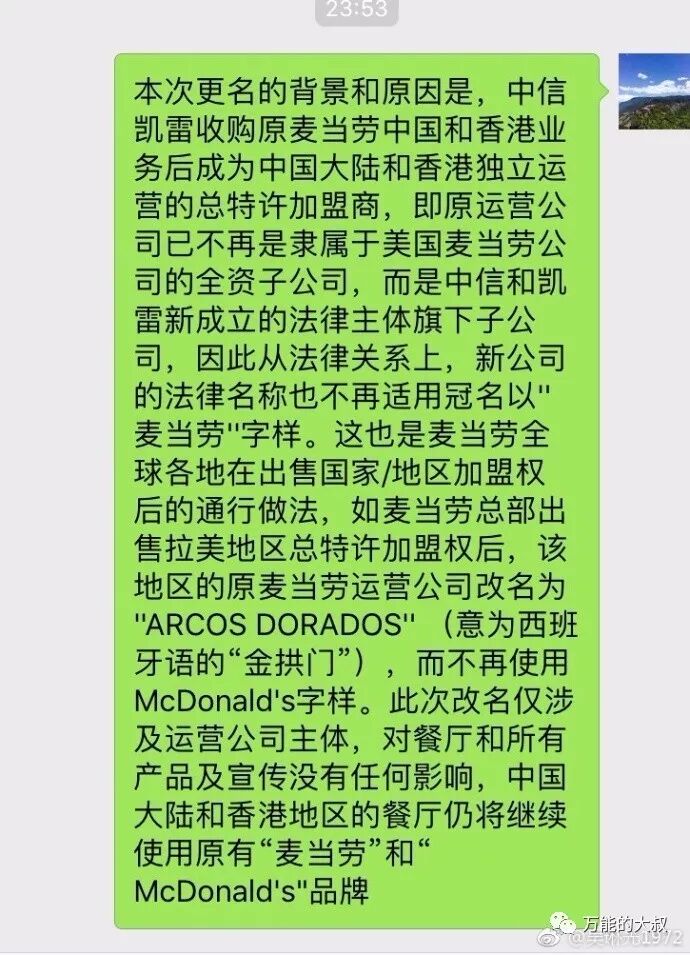 从昨晚开始,一直到今天,一个事刷屏了:麦当劳改名为“金拱门”。