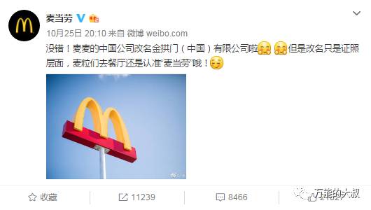 2、品牌力。这也是一个基础。麦当劳的品牌在全球都是排名前十的,砸了那么多广告,开了那么多门店,在中国可谓家喻户晓,如果是一个创业公司起了一个很奇特的名字,显然无法实现刷屏。当然,这点对于小品牌来说是无法效仿的,但对于量级比较大的品牌来说,倒是一个可借鉴的方式。当然,改名字只是一种方式,不是万金油,预埋槽点是万金油。