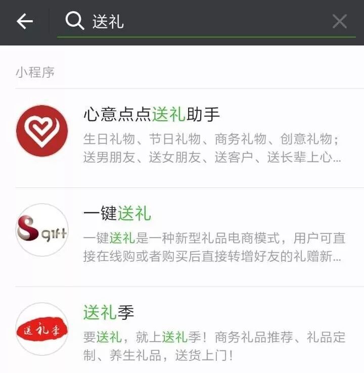二是利用微信本身的功能。比如公众号关联小程序,包括自有公众号以及合作公众号;比如小程序搜索入口,我们会设置10个关键词,现在用户搜索“送礼”,心意点点送礼助手还排第一位;还有公众号模板消息,既能通过服务号推送拉新,又能唤醒已有的小程序用户。
