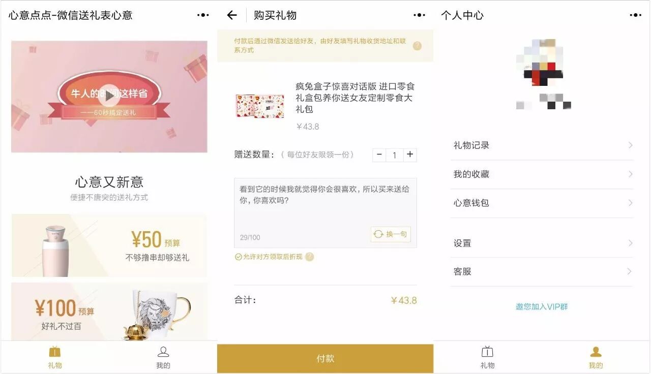 心意点点礼物助手和订蛋糕+都是送礼小程序。整个界面与电商小程序无异,唯一的区别是:送货地址由收礼人填写,如果他不满意,可将礼物折现。折现时平台会收取一定比例的服务费,且这一行为对送礼人不可见。