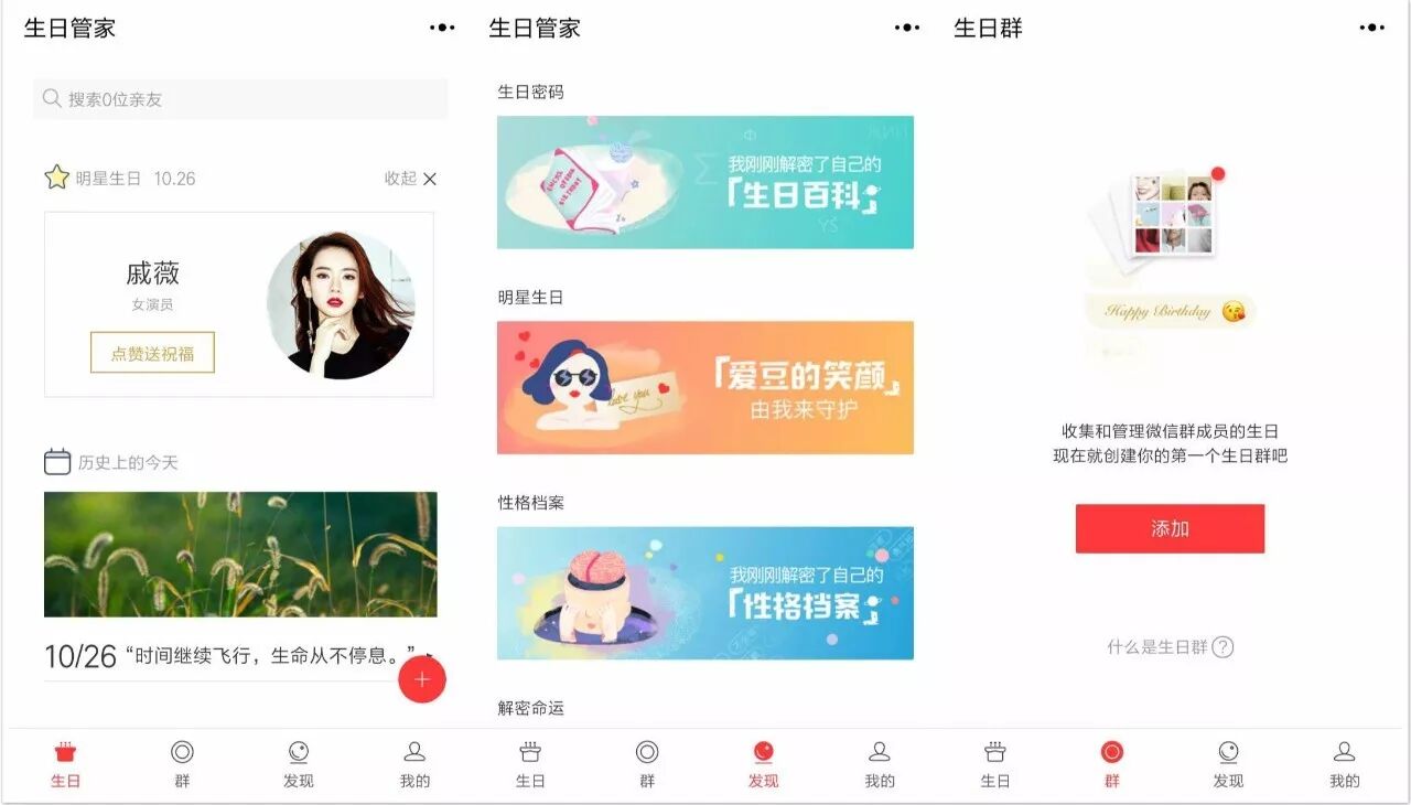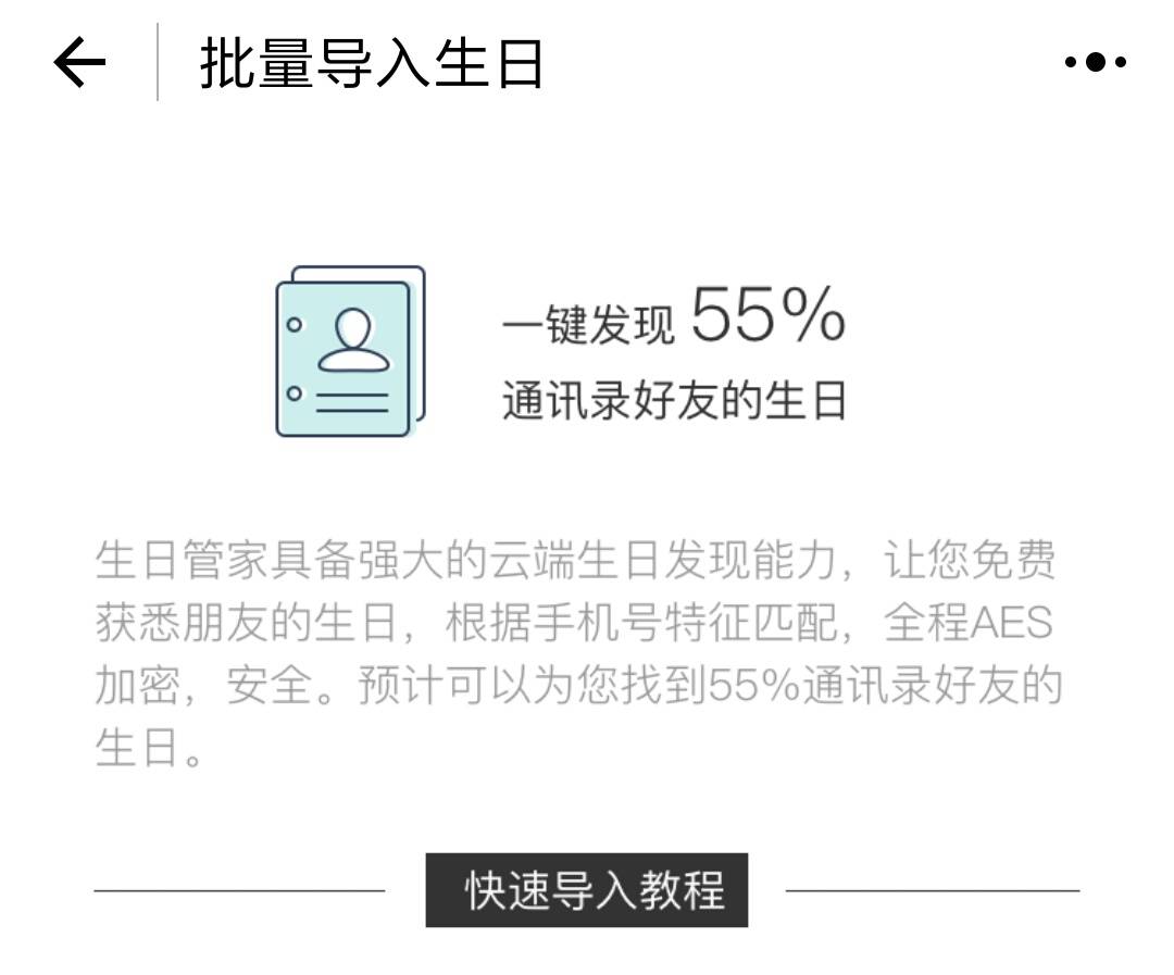 生日管家是一个生日管理小程序。目前主要提供三种服务:一是朋友生日的记录和管理;二是历史上的今天、明星生日的获取;三是性格档案、星座命运等小游戏。用户可以自行记录朋友生日,也可分享小程序到微信群,让群友填写生日信息。