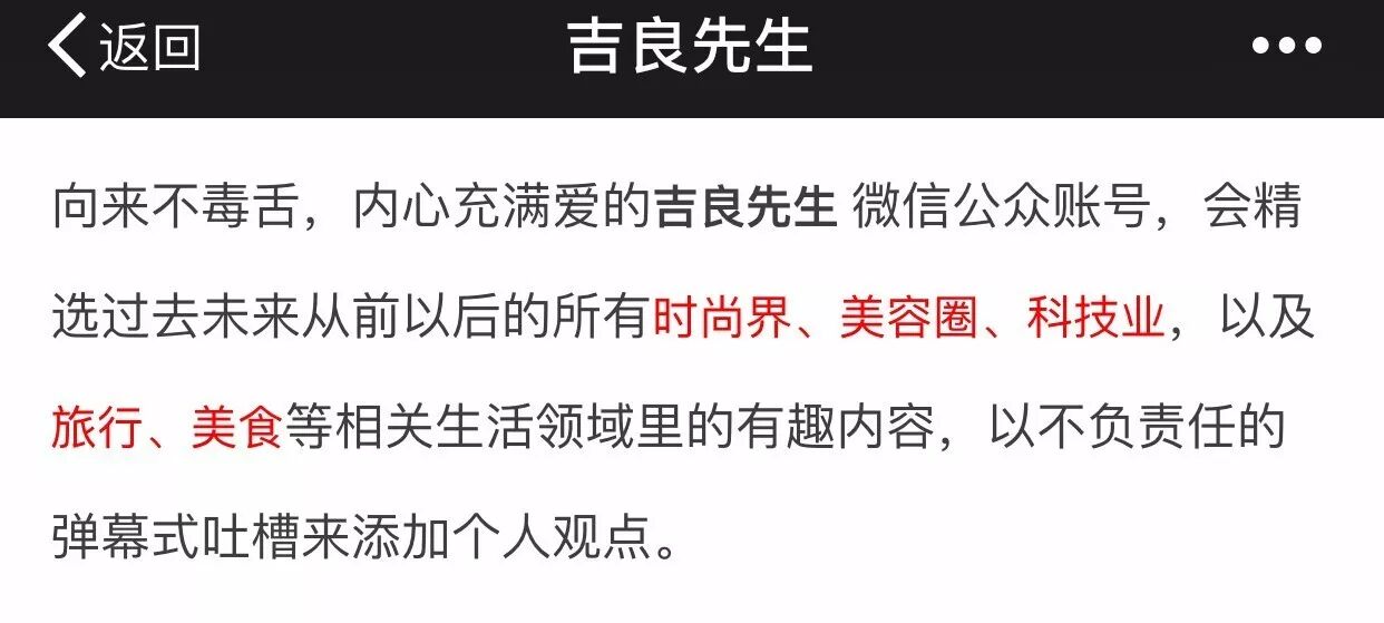 除了不怎么“光鲜”外,吉良先生也并不“毒舌”。“向来不毒舌,内心充满爱”,是他的公众号介绍语,他精选了时尚、美容、科技、旅行、美食等领域的有趣内容,“以不负责任的弹幕式吐槽来添加个人观点”。