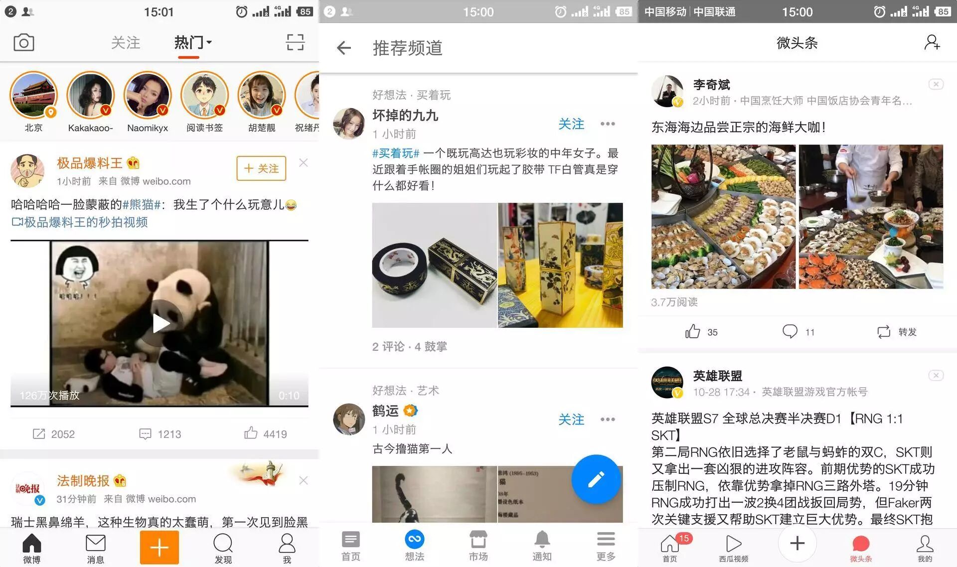 左为微博热门界面,中为知乎想法界面,右为今日头条微头条界面