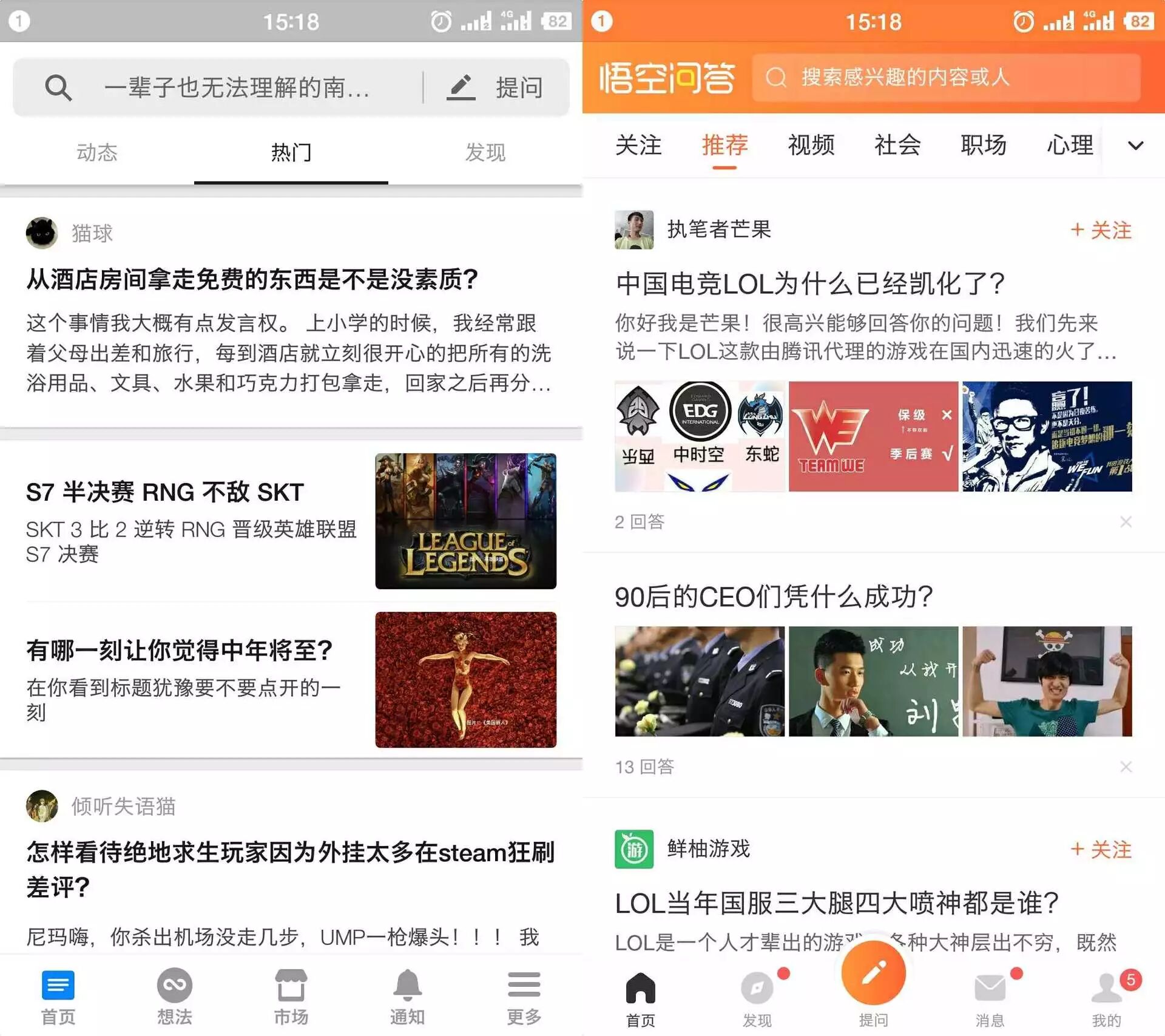 左为知乎,右为悟空问答,最近刺猬君在关注英雄联盟全球总决赛,它俩一直都在给刺猬君推荐相关内容
