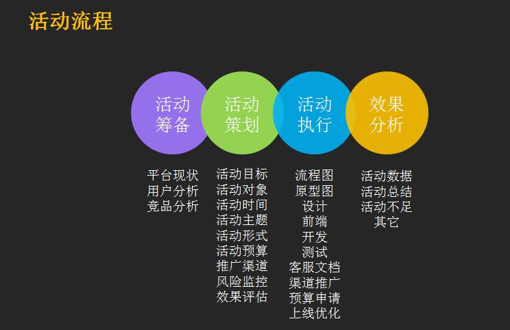 那么,如何策划一场好的活动呢?简单来说,活动流程分四步,分别是活动筹备—活动策划—活动执行—效果分析。活动筹备期,主要针对平台现状、用户和竞品展开分析。完成了一系列的分析后,在活动策划期间,对活动目标、对象、时间、主题、形式都能有参考依据,而活动预算,则需要根据产品的实际情况而定,最好能够通过优惠券或者合作的形式,降低成本的支出。作为策划活动的运营人员而言,活动执行期最重要的工作就是沟通,与活动相关的各个工作人员的工作进展,都依赖于活动策划人员跟进。活动上线后,需要对活动的效果进行总结复盘,能够修复的问题及时优化,并在下一次活动策划汲取经验教训。