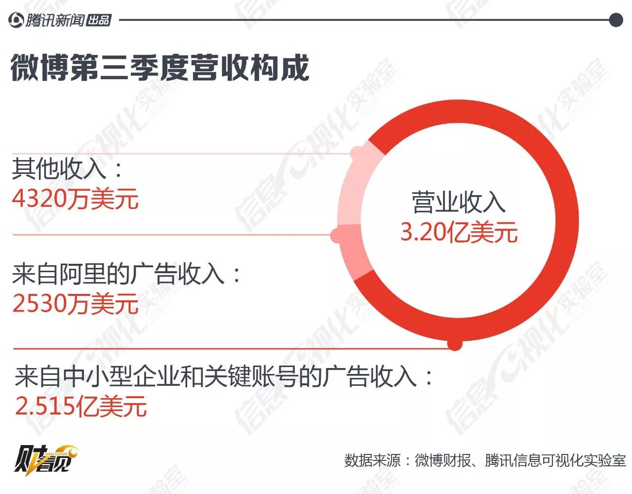 关于微博Q3的营收构成,腾讯新闻做的这张图很清晰,可以看到来自中小型企业和关键账号的广告和营销收入占了很大部分:
