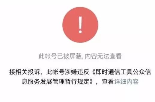 被封账号显示“此账号涉嫌违反《即时通信工具公众号信息服务发展管理暂行规定》”。