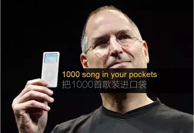 还是乔布斯,当时推出ipod的时候,他在发布会上就直接说了这么一句经典广告:“把1000首歌装进口袋”。