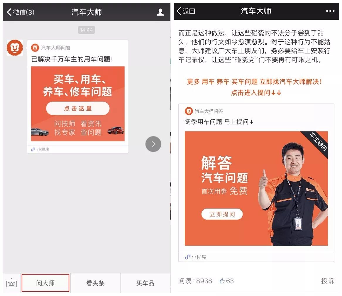 “汽车大师”有100多万用户,公众号从用车出发,为用户提供结构化的知识。小程序则为用户解决现实生活中遇到的问题。也就是从资讯到询问再到购买,产生交易闭环。