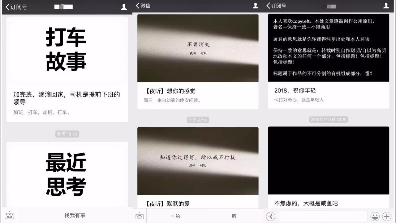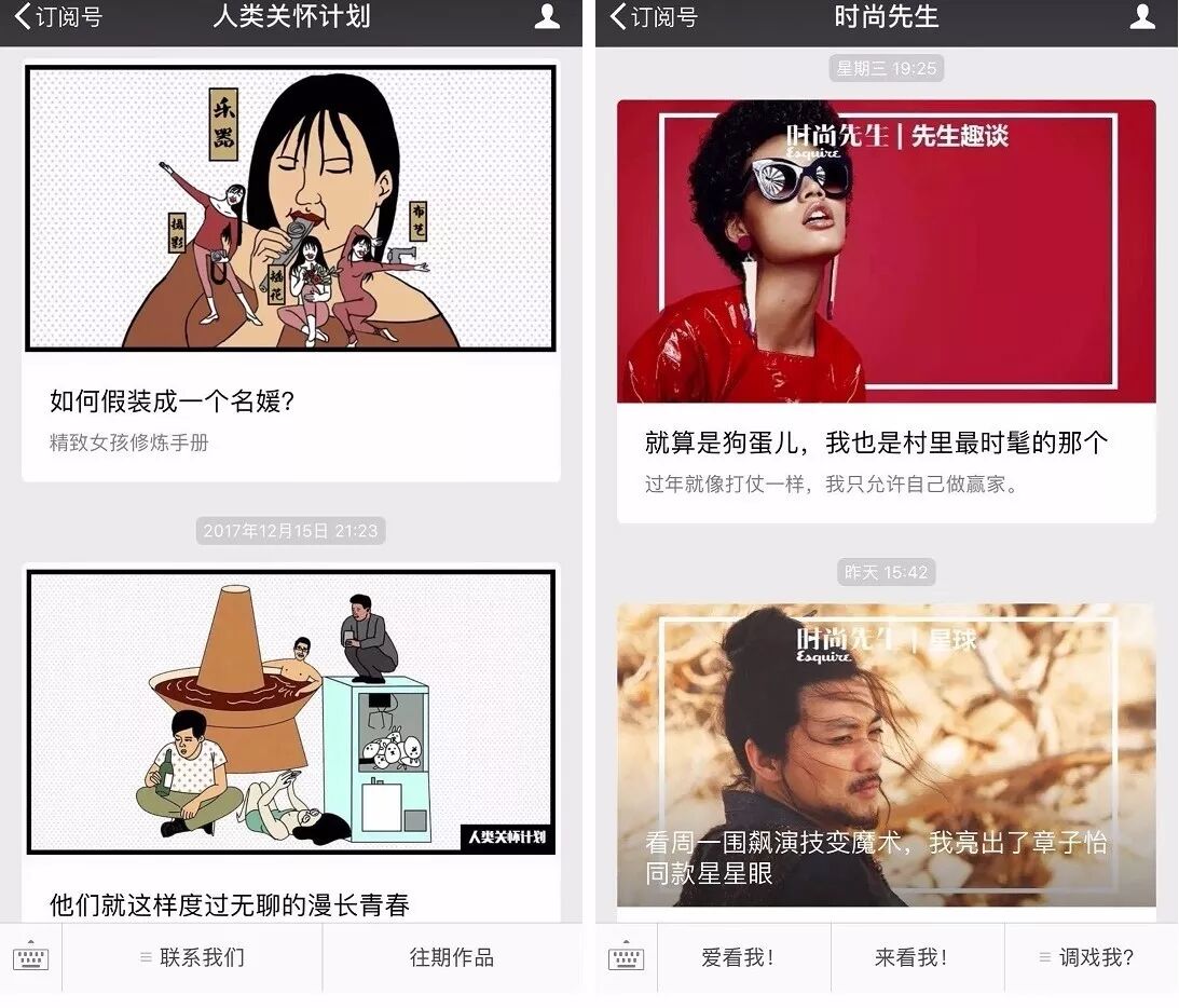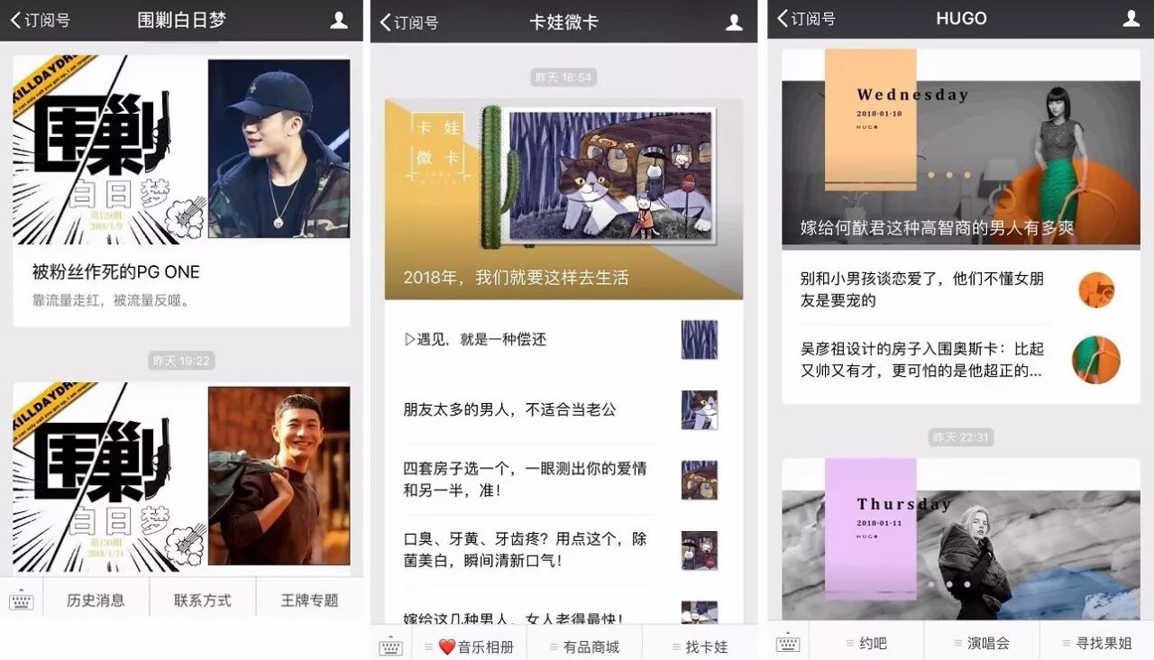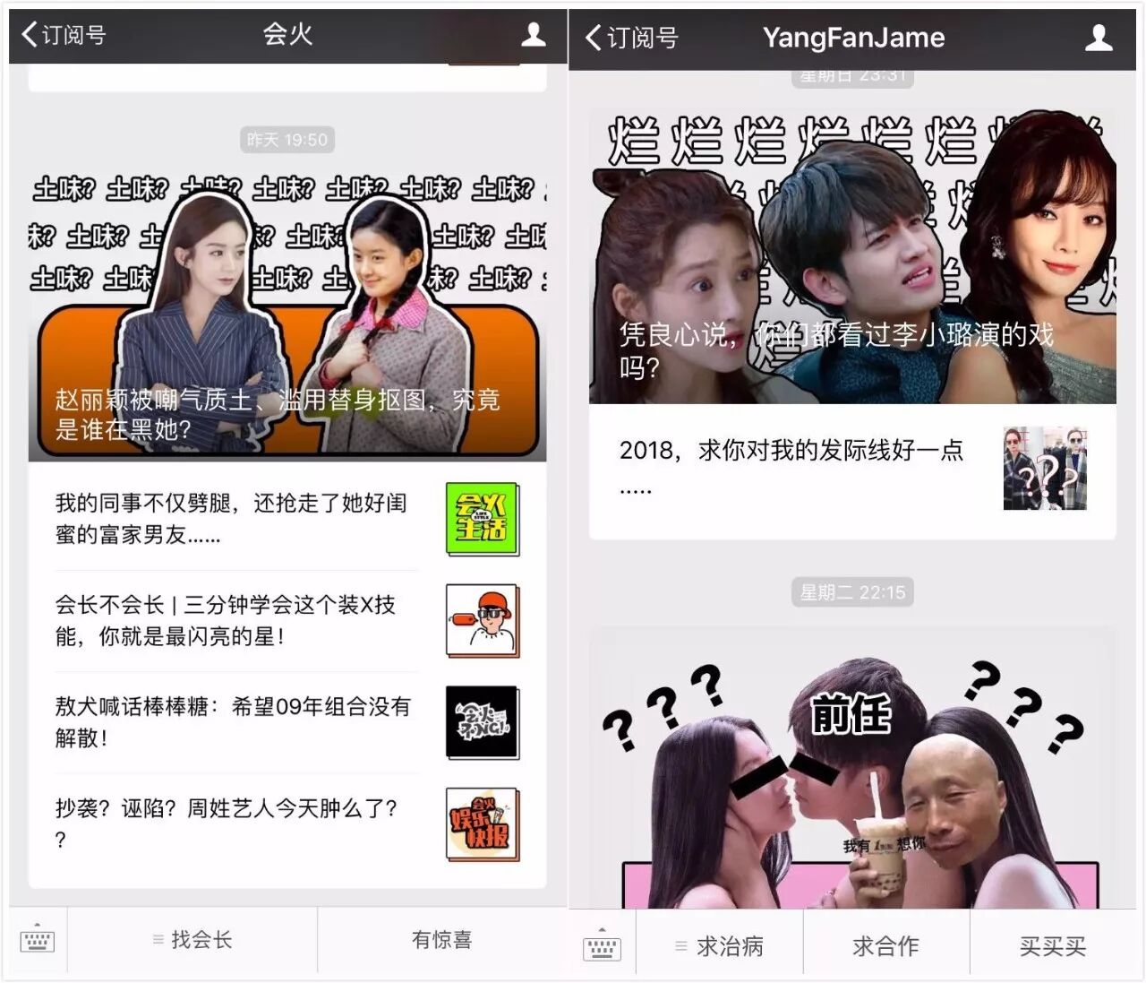 有“会火”“深夜发媸”“haruru”“YangFanJame”等等这样的娱乐时尚号。其中“深夜发媸”告诉我们,后台粉丝对新的设计风格“特别喜欢”,反馈热烈。不仅如此,虽然这对公众号的阅读数据没有太巨大的变化,但也确实“略有提高”。