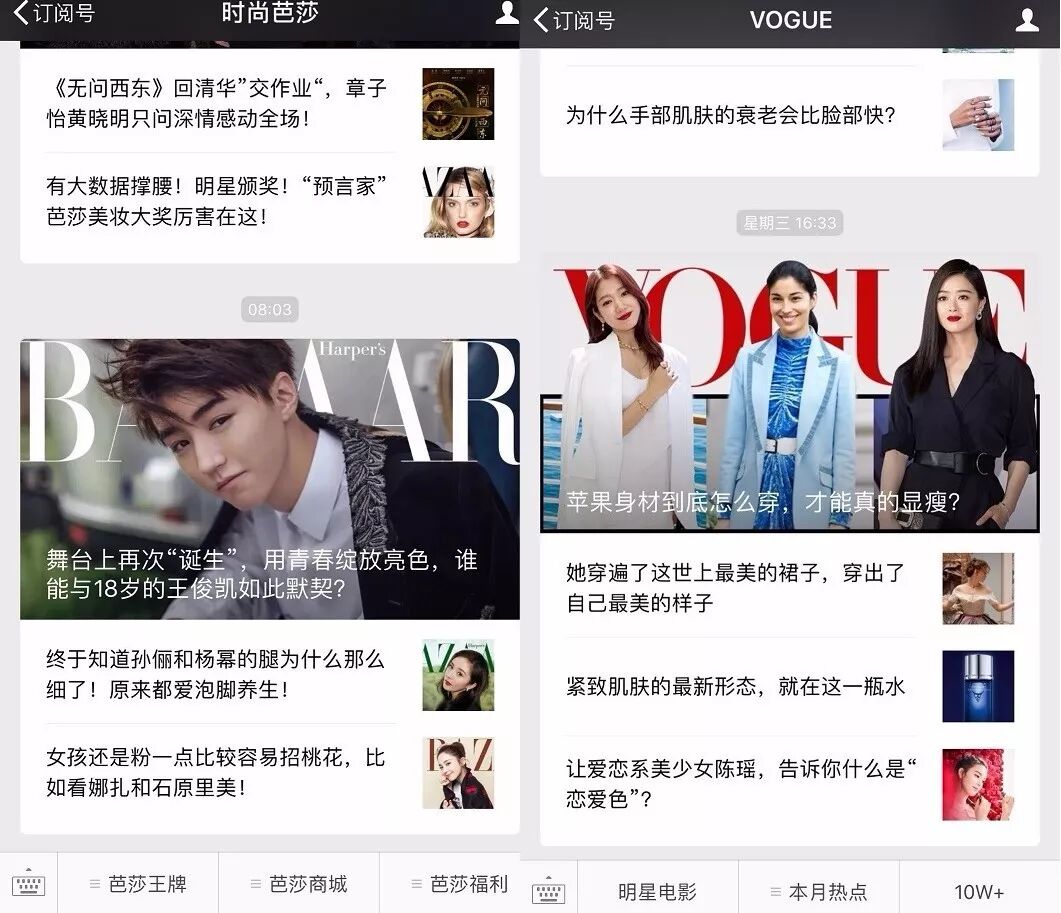 关注时尚的盆友们可能觉得这种风格很眼熟,时尚杂志的封面不就长这样吗?“时尚芭莎”“VOGUE”“世界时装之苑ELLE”“海报网”等公号就采用了与纸质杂志封面一脉相承的设计。