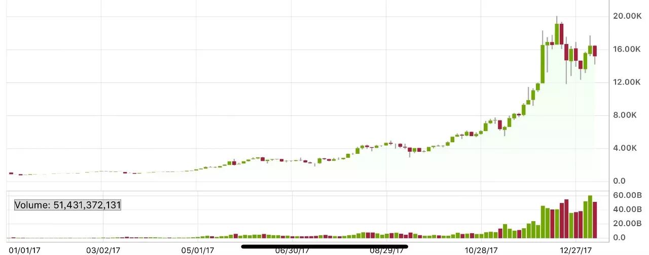 比特币兑美元的交易价格,从2017年初的970美元,一路上涨,2017年12月18日一度突破2万美元。一年内飙升超过20倍的发财机会,一个人一辈子能遇到几次?这条动人的曲线,总是会让人回想起2014年底到2015年上半年中国股市的那条曲线。