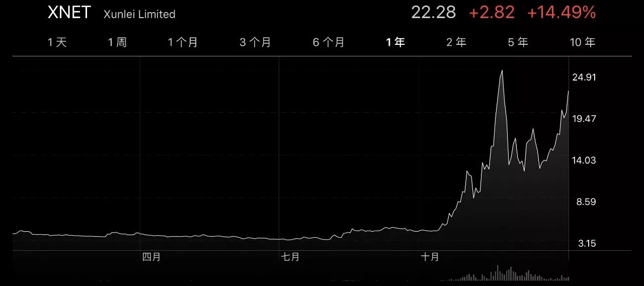 前脚比特币交易被政府禁止,后脚替代品就不失时机地出现了,它叫玩客币。迅雷控制的这种虚拟币在短短几周内价格翻了80倍,这带动了玩客币挖矿设备玩客云的热销。玩客云在京东的预售通常是一秒售罄,400元的设备,在黑市上被炒到2000元。长年徘徊在4美元左右的迅雷股价,也开始了它的起飞。