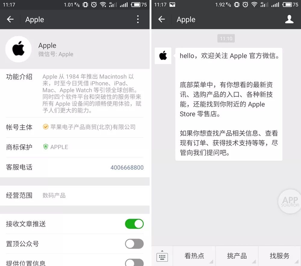 据AppSo 1月18日,苹果上线了官方微信公众号,账号主体为“苹果电子产品商贸(北京)有限公司”。