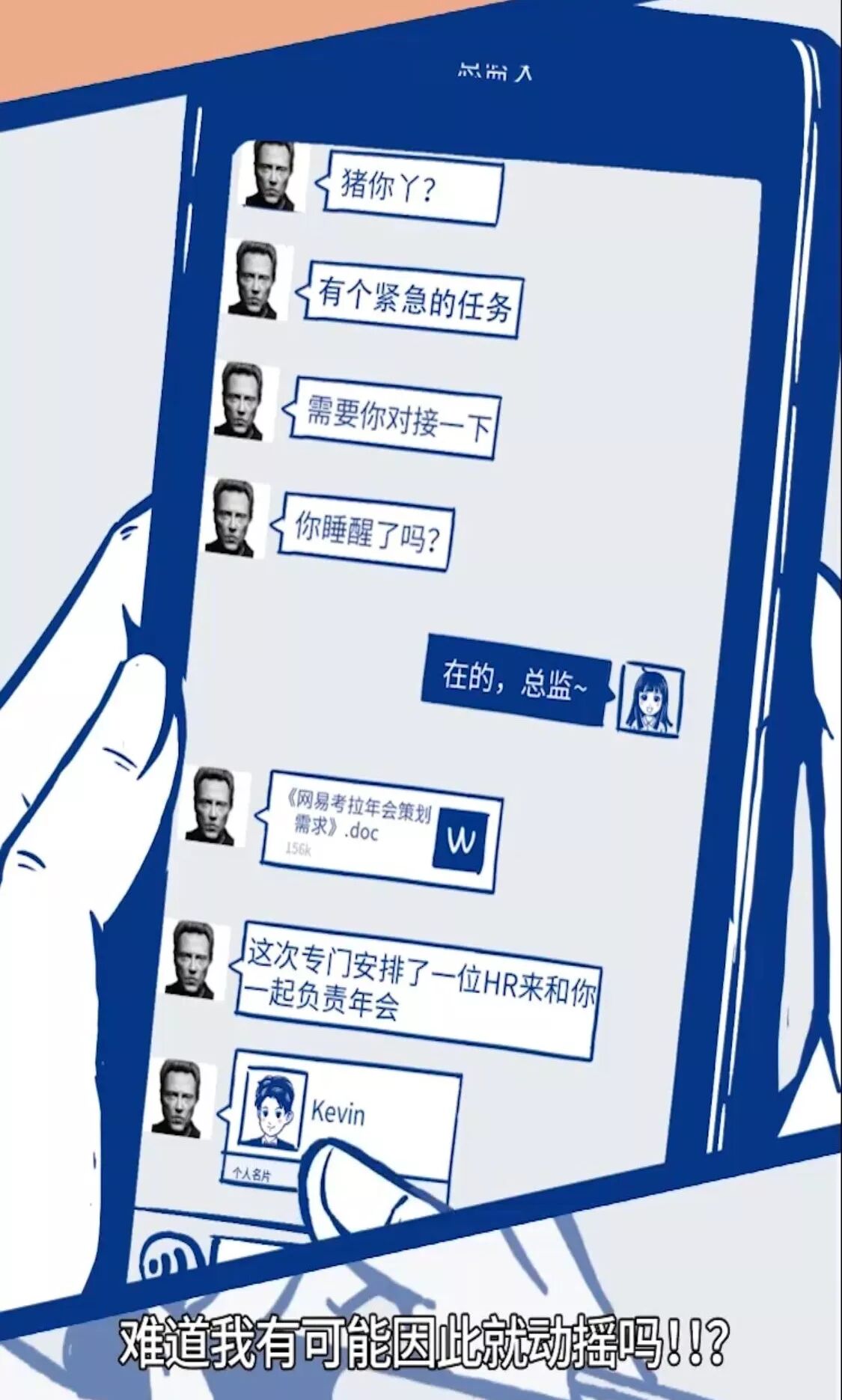 网易选择了年会策划为背景,故事也符合目前很多职场上的你我他,H5中更是几乎全篇使用了手绘形式。