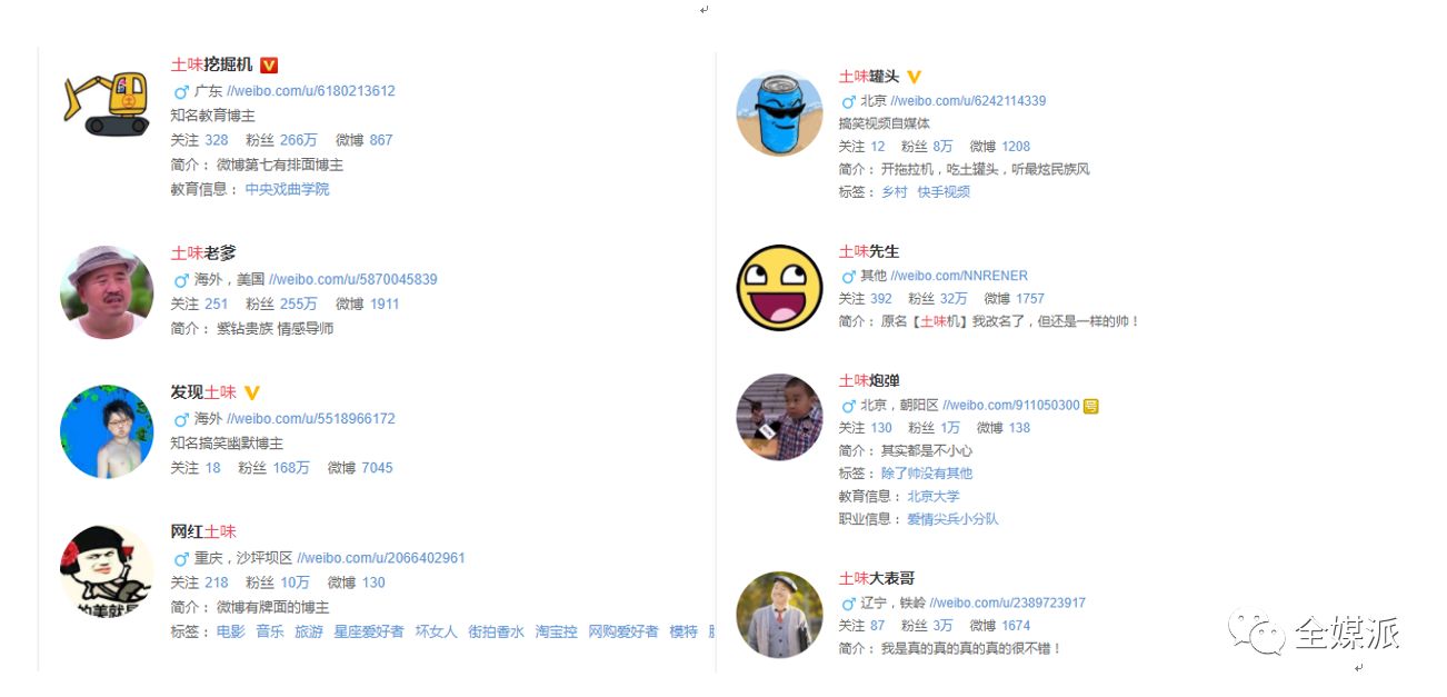 以“土味”为关键词进行微博用户搜索,除了坐拥250万+粉丝的土味挖掘大号 “土味老爹”、“土味挖掘机”之外,还有“发现土味”、“土味先生”等十几个粉丝数过万的微博账号。