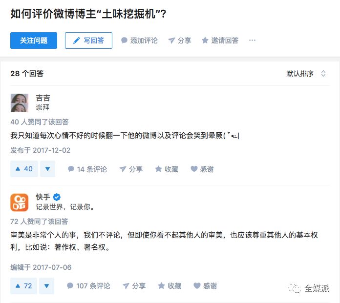 面对微博大号的土味挖掘,快手品牌方甚至在“如何评价微博博主 ‘土味挖掘机’?”问题中怼了起来。